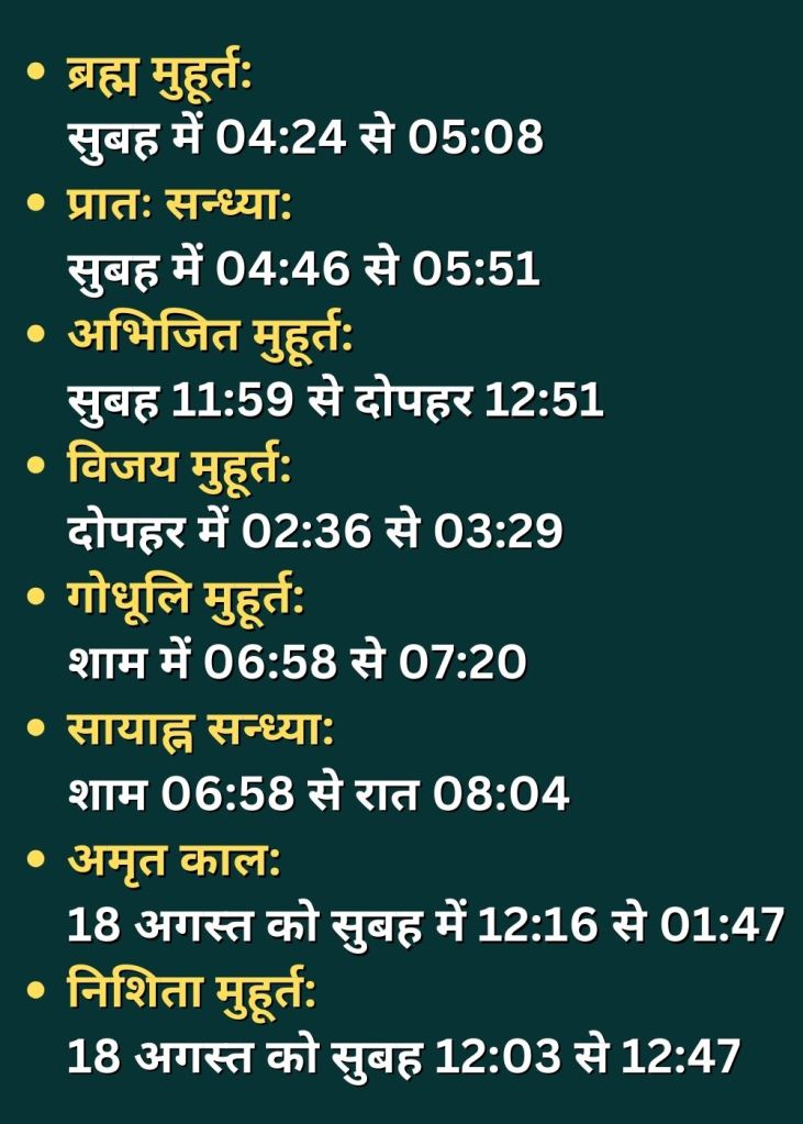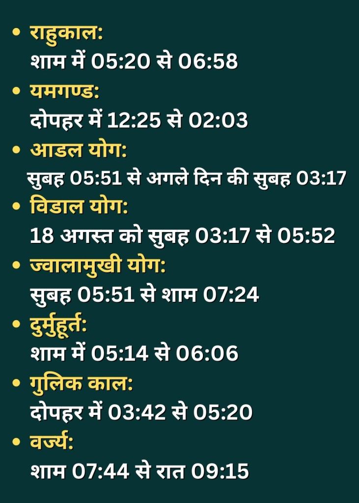 सूर्य देव को समर्पित रविवार के दिन रोहिणी व्रत भी है। साथ ही मलयालम नव वर्ष का आरंभ हो रहा है। इसके अलावा पूरे दिन दिशा शूल पश्चिम रहेगी। वहीं, रविवार को सूर्योदय प्रात: काल 05 बजकर 51 मिनट के आसपास हो सकता है। जबकि सूर्यास्त शाम में करीब 06 बजकर 58 मिनट पर और चंद्रास्त दोपहर में 02 बजकर 11 मिनट पर होगा। बता दें कि 17 अगस्त की जगह 18 अगस्त को प्रात: काल 12 बजकर 24 मिनट के आसपास चंद्रोदय होने की संभावना है।
