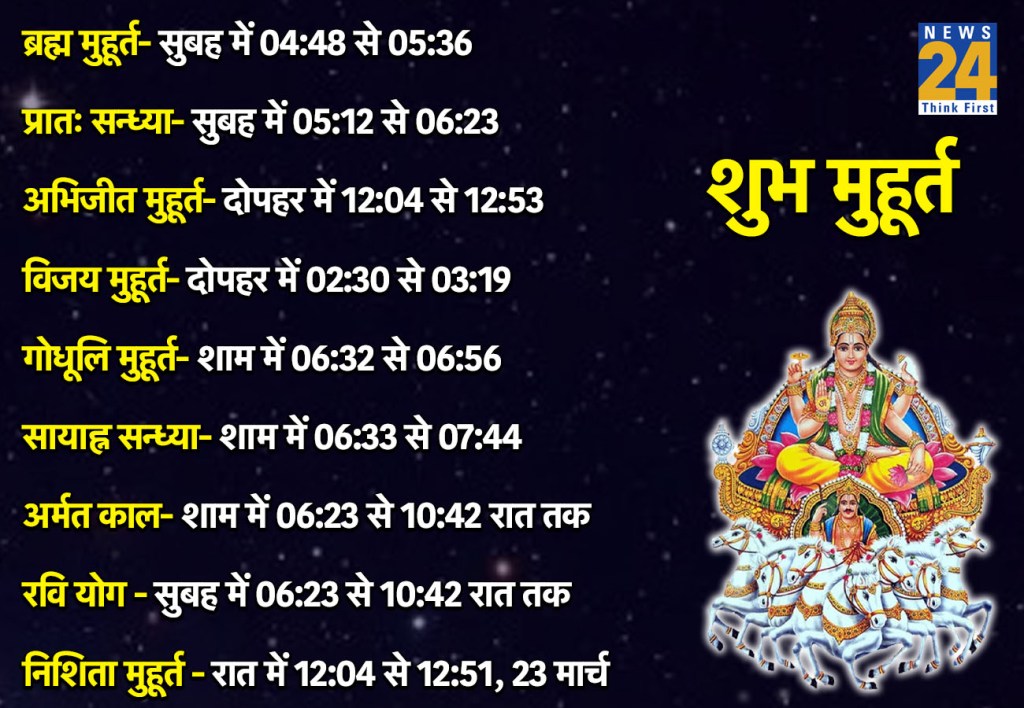 तिथि – 22 मार्च को दिन की शुरुआत चतुर्थी तिथि के साथ हो रही है इसका समापन रात को 9 बजकर 16 मिनट पर हो जाएगा. उदयातिथि के आधार पर चतुर्थी तिथि मान्य होगी.