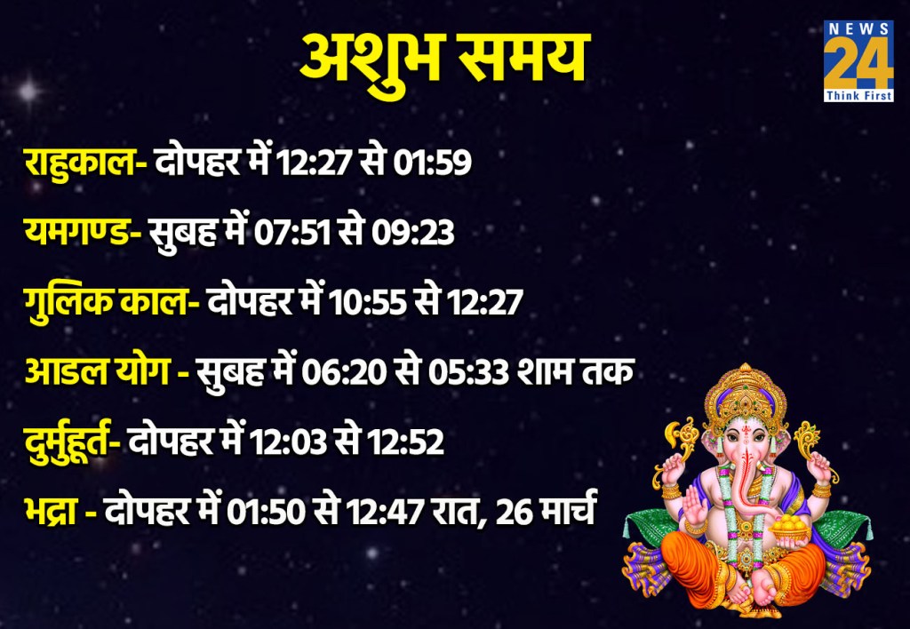 рддрд┐рдерд┐ тАУ 25 рдорд╛рд░реНрдЪ рдХреА рд╢реБрд░реБрдЖрдд рд╕рдкреНрддрдореА рддрд┐рдерд┐ рдХреЗ рд╕рд╛рде рд╣реЛ рд░рд╣реА рд╣реИ рдЗрд╕рдХрд╛ рд╕рдорд╛рдкрди рджреЛрдкрд╣рд░ рдХреЛ 1 рдмрдЬрдХрд░ 50 рдорд┐рдирдЯ рдкрд░ рд╣реЛ рдЬрд╛рдПрдЧрд╛. рдЗрд╕рдХреЗ рдмрд╛рдж рдЕрд╖реНрдЯрдореА рддрд┐рдерд┐ рдЖрд░рдВрдн рд╣реЛрдЧреА. рдЙрджрдпрд╛рддрд┐рдерд┐ рдХреЗ рдЖрдзрд╛рд░ рдкрд░ рд╕рдкреНрддрдореА рддрд┐рдерд┐ рдорд╛рдиреНрдп рд╣реЛрдЧреА. рдорд╛рд╣ тАУ рдЪреИрддреНрд░ рдкрдХреНрд╖ тАУ рд╢реБрдХреНрд▓ рдкрдХреНрд╖ рдХрд░рдг тАУ рд╡рдгрд┐рдЬ, рд╡рд┐рд╖реНрдЯрд┐ рдФрд░ рдмрд╡ рдирдХреНрд╖рддреНрд░ тАУ рдореГрдЧрд╢рд┐рд░рд╛ рдФрд░ рдЖрд░реНрджреНрд░рд╛ рдпреЛрдЧ тАУ рд╕реМрднрд╛рдЧреНрдп, рд╢реЛрднрди рджрд┐рди тАУ рдмреБрдзрд╡рд╛рд░ рджрд┐рд╢рд╛рд╢реВрд▓ тАУ рдЙрддреНрддрд░