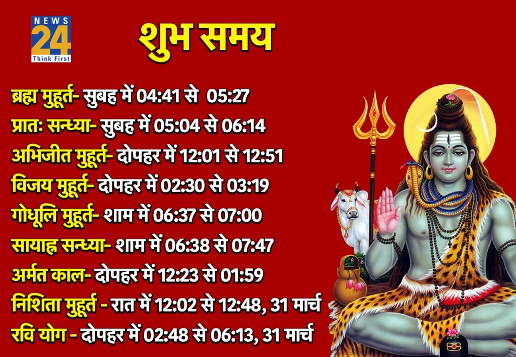 рддрд┐рдерд┐ тАУ 30 рдорд╛рд░реНрдЪ рдХреЛ рд╕реЛрдо рдкреНрд░рджреЛрд╖ рд╡реНрд░рдд рд░рдЦрд╛ рдЬрд╛рдПрдЧрд╛. рд╕реБрдмрд╣ рд╕реБрдмрд╣ 7 рдмрдЬрдХрд░ 9 рдорд┐рдирдЯ рддрдХ рджреНрд╡рд╛рджрд╢реА рддрд┐рдерд┐ рд░рд╣реЗрдЧреА. рдЗрд╕рдХреЗ рдмрд╛рдж рддреНрд░рдпреЛрджрд╢реА рддрд┐рдерд┐ рдХрд╛ рдЖрд░рдВрдн рд╣реЛ рдЬрд╛рдПрдЧрд╛. рдЙрджрдпрд╛рддрд┐рдерд┐ рдХреЗ рдЖрдзрд╛рд░ рдкрд░ рджреНрд╡рд╛рджрд╢реА рддрд┐рдерд┐ рдорд╛рдиреНрдп рд╣реЛрдЧреА. рдорд╛рд╣ тАУ рдЪреИрддреНрд░ рдкрдХреНрд╖ тАУ рд╢реБрдХреНрд▓ рдкрдХреНрд╖ рдХрд░рдг тАУ рдмрд╛рд▓рд╡, рдХреМрд▓рд╡ рдФрд░ рддреИрддрд┐рд▓ рдирдХреНрд╖рддреНрд░ тАУ рдордШрд╛ рдФрд░ рдкреВрд░реНрд╡рд╛рдлрд╛рд▓реНрдЧреБрдиреА рдпреЛрдЧ тАУ рд╢реВрд▓ рдФрд░ рдЧрдгреНрдб рджрд┐рди тАУ рд╕реЛрдорд╡рд╛рд░ рджрд┐рд╢рд╛рд╢реВрд▓ тАУ рдкреВрд░реНрд╡