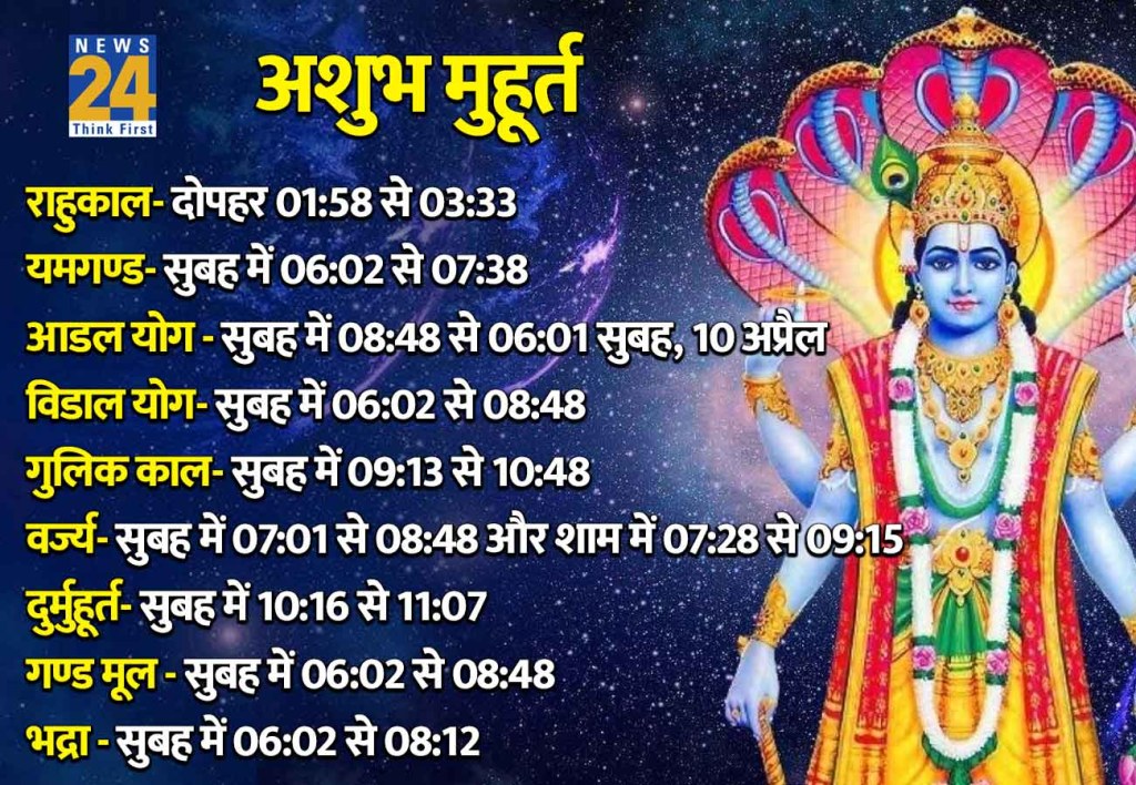 рддрд┐рдерд┐ тАУ 9 рдЕрдкреНрд░реИрд▓ рдХреЛ рджрд┐рди рдХреА рд╢реБрд░реБрдЖрдд рд╕рдкреНрддрдореА рддрд┐рдерд┐ рдХреЗ рд╕рд╛рде рд╣реБрдИ. рдЗрд╕ рддрд┐рдерд┐ рдХрд╛ рд╕рдорд╛рдкрди рд░рд╛рдд рдХреЛ 9 рдмрдЬрдХрд░ 19 рдорд┐рдирдЯ рдкрд░ рд╣реЛрдЧрд╛. рдЗрд╕рдХреЗ рдмрд╛рдж рдЕрд╖реНрдЯрдореА рддрд┐рдерд┐ рдЖрд░рдВрдн рд╣реЛ рдЬрд╛рдПрдЧреА.