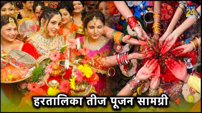 Hartalika Teej Puja Samagri List: हरतालिका तीज व्रत अब नजदीक आ रहा है। इस साल हरतालिका तीज व्रत 18 सितंबर 2023 को रखा जाएगा। इस दिन महिलाएं बहुत ही धूमधाम से व्रत को रखती है। इस व्रत में ऐसे कई जरूरी सामग्री होते हैं, उन्हें भूल जाने पर भगवान शिव, माता पार्वती और गणेश भगवान नाराज हो जाते हैं। धार्मिक मान्यताओं के अनुसार, इस व्रत को करने में पूजा सामग्री का खास ध्यान रखना पड़ता है। तो आज इस खबर में हरतालिका तीज व्रत में उपयोग किए जाने वाले पूजा सामग्री के बारे में। अगर आप भी हरतालिका तीज व्रत रखते हैं, तो इन पूजा सामग्रियों से भगवान शिव, माता पार्वती और भगवान गणेश की पूजा अवश्य करें। ऐसा करने से आपको शुभ फल की प्राप्ति होगी। इसके साथ ही आपकी सारी इच्छाएं पूरी हो जाएगी। तो आइये जानते हैं हरतालिका तीज व्रत की पूजन सामग्री के बारे में।