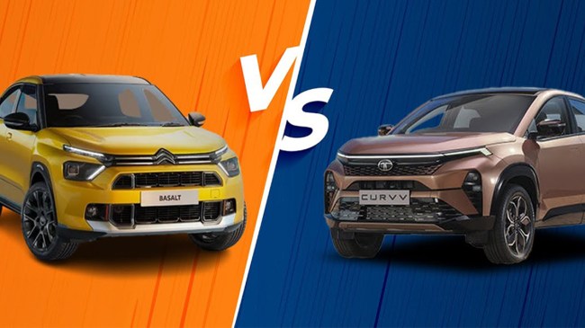 Citroen Basalt vs Tata Curvv: भारतीय कार बाजार में टाटा मोटर्स ने अपनी पहली कूपे एसयूवी EV को लॉन्च किया जो सेगमेंट-फर्स्ट फीचर्स की वजह से चर्चा में है। वहीं दूसरी तरफ सिट्रोएन ने भी अपनी पहली कूपे एसयूवी बेसाल्ट को बाजार में उतार दिया जो अपनी कम कीमत की वजह से खूब चर्चा में है। इन दोनों गाड़ियों ने फिर से कूपे सेगमेंट की शुरुआत कर दी है। आइये जानते है इन दोनों में से कौन सा मॉडल ज्यादा बेहतर है?