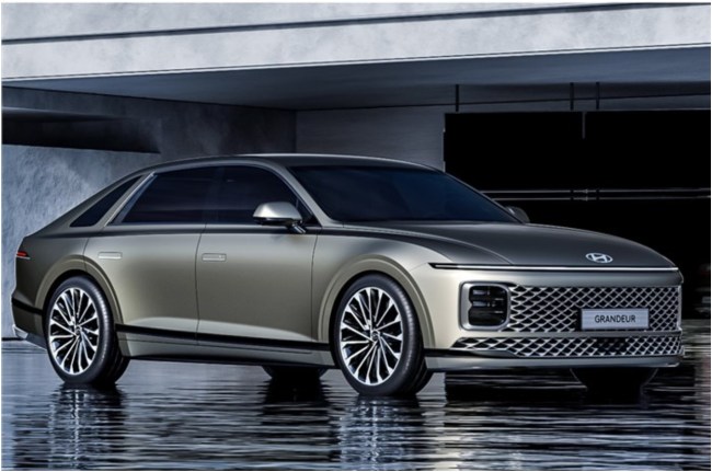 ग्रैंड्योर का फ्रंट 2021 में सामने आई स्टारिया एमपीवी के समान दिखता है। इसमें एक फुल विड्थ एलईडी डीआरएल लाइट बार और फुल लैंथ हॉरिजेंटल ग्रिल शामिल है, जो मुख्य हेडलाइट क्लस्टर से घिरी हुई है। प्रोफाइल में यह फ्लश डोर हैंडल, मिनिमम कट और क्रीज के साथ एक क्लियर लुक देती है। इसमें 1986 की ऑरिजिनल ग्रैंड्योर की तरह एक अलग तरह का क्वार्टर ग्लास भी मिलता है।