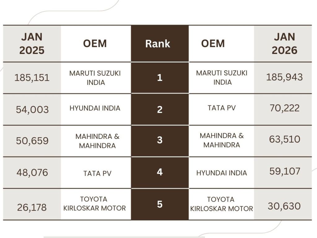 हुंडई मोटर इंडिया, टाटा मोटर्स, महिंद्रा और महिंद्रा ने तो अब तक की सबसे ज्यादा बिक्री की है. देश की सबसे बड़ी कार निर्माता कंपनी मारुति सुजुकी इंडिया ने जनवरी 2026 में 185,943 यूनिट्स के साथ कुछ खास तो नहीं लेकिन जनवरी 2025 में बेची गईं 185,151 यूनिट्स के मुकाबले थोड़ी सी बढ़त जरूर हासिल की है. हालांकि, अगर कुल बिक्री की बात करें तो 2,36,963 यूनिट्स बेची गई हैं जिसमें (PV+LCV+OEM+Exports) शामिल है.