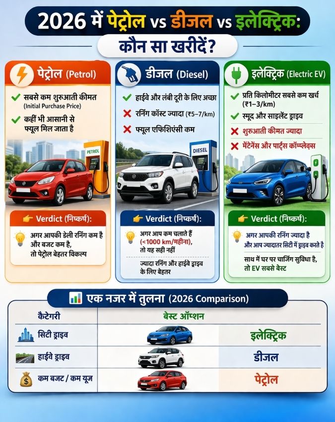 Petrol vs Diesel vs Electric Car: рдЖрдЬ рдХреЗ рд╕рдордп рдореЗрдВ рдирдИ рдХрд╛рд░ рдЦрд░реАрджрдирд╛ рдкрд╣рд▓реЗ рдЬрд┐рддрдирд╛ рдЖрд╕рд╛рди рдлреИрд╕рд▓рд╛ рдирд╣реАрдВ рд░рд╣ рдЧрдпрд╛ рд╣реИ. рдкреЗрдЯреНрд░реЛрд▓, рдбреАрдЬрд▓, рдЗрд▓реЗрдХреНрдЯреНрд░рд┐рдХ рдпрд╛ рд╣рд╛рдЗрдмреНрд░рд┐рдб рд╣рд░ рд╡рд┐рдХрд▓реНрдк рдЕрдкрдиреЗ рд╕рд╛рде рдлрд╛рдпрджреЗ рдФрд░ рдиреБрдХрд╕рд╛рди рд▓реЗрдХрд░ рдЖрддрд╛ рд╣реИ. рдРрд╕реЗ рдореЗрдВ рд╕рд╣реА рдЪреБрдирд╛рд╡ рд╡рд╣реА рд╣реИ рдЬреЛ рдЖрдкрдХреА рдЬрд░реВрд░рдд рдФрд░ рдЗрд╕реНрддреЗрдорд╛рд▓ рдХреЗ рд╣рд┐рд╕рд╛рдм рд╕реЗ рдлрд┐рдЯ рдмреИрдареЗ, рди рдХрд┐ рд╕рд┐рд░реНрдл рдЯреНрд░реЗрдВрдб рджреЗрдЦрдХрд░ рд▓рд┐рдпрд╛ рдЬрд╛рдП.