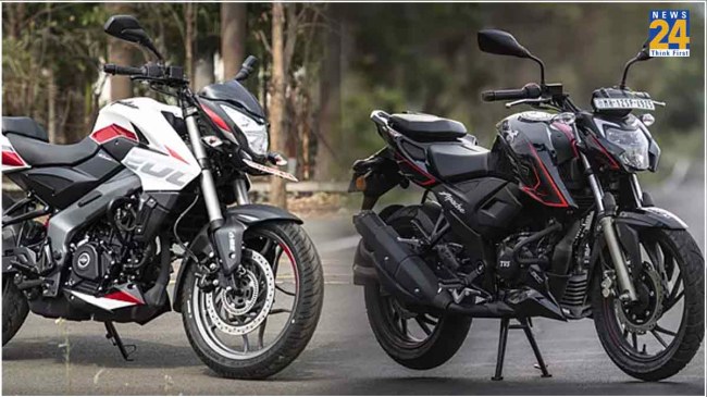 Bajaj Pulsar NS200 & TVS Apache RTR 200 4V 200cc bikes details in hindi: बाजार में टीवीएस और बजाज की 150 से 200 सीसी बाइक्स की हाई डिमांड रहती है। बजाज की पल्सर और टीवीएस की Apache कंपनियों के हाई सेलिंग मॉडल हैं। इनकी मिड सेगमेंट वेरिएंट में दो दमदार बाइक हैं Bajaj Pulsar NS200 और TVS Apache RTR 200 4V. दोनों बाइक्स यंगस्टर्स के लिए बेहद ट्रेंडी लुक्स और कलर ऑप्शन में आती हैं। इनमें सेफ्टी के लिए डिस्क ब्रेक और आरामदायक स्प्लिट सीट दी गई है।