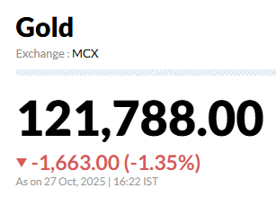 Gold prices mega dropping around 10000 rs: सोने के लगातार गिरते दाम रिकॉर्ड हाई रेट से 10 हजार रुपये नीचे आ चुके हैं. करीब एक लाख 33 हजार के करीब प्रति 10 ग्राम तक पहुंच चुके 24 कैरेट सोने के दाम अब MCX पर 1663 रुपये कम होकर एक लाख 21 हजार 773 रुपये पर पहुंच चुके हैं. वहीं, 24 कैरेट सोने के IBJA पर दाम एक लाख 22 हजार 419 रुपये प्रति 10 ग्राम तक पहुंचे है. गुड रिटर्न वेबसाइट पर 27 अक्टूबर को 1140 रुपये कम होकर 24 कैरेट सोने के दाम एक लाख 24 हजार 480 रुपये प्रति 10 ग्राम पर रह गए हैं. सोने के रिकार्ड हाई रेट से तुलना की जाए तो सोना 10 हजार रुपये तक सस्ता हो चुका है. वहीं, इंटरनेशनल मार्केट में स्पॉट गोल्ड के दाम में 6% से ज्यादा की गिरावट दिखी है. रिकॉर्ड हाई $4,381.21 प्रति औंस तक पहुंचा सोना अब $4,100 के आसपास आ गया है. यह 2013 के बाद का सबसे बड़ा एक दिन का नुकसान है.