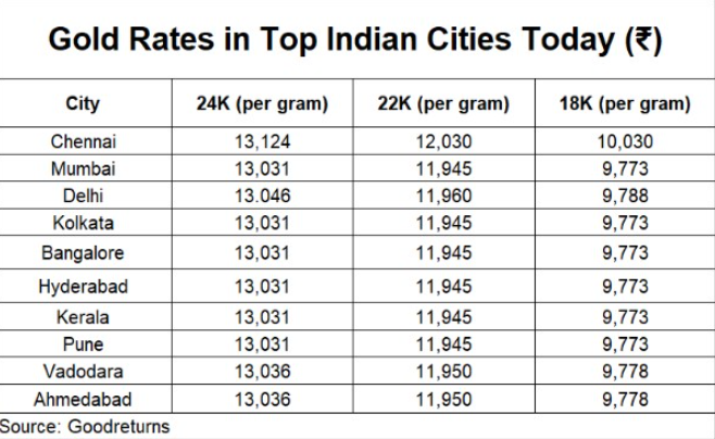 कोलकाता में 24 कैरेट सोने की कीमतें 1,30,320 रुपये प्रति 10 ग्राम रहीं और 22 कैरेट गोल्ड के दाम 1,19,610 रुपये प्रति 10 ग्राम रहे. - चेन्नई में 24 कैरेट सोने की कीमतें 1,31,250 रुपये प्रति 10 ग्राम रहीं और 22 कैरेट गोल्ड के दाम 1,20,310 रुपये प्रति 10 ग्राम रहे.