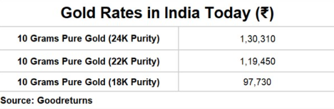 - मुंबई में 24 कैरेट सोने की कीमतें 1,30,310 रुपये प्रति 10 ग्राम रहीं और 22 कैरेट गोल्ड के दाम 1,19,460 रुपये प्रति
