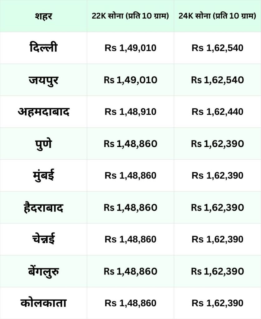 प्रमुख शहरों में 22ct और 24ct गोल्ड के दाम (बिना GST)