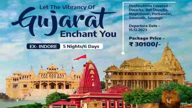 इंडियन रेलवे केटरिंग एंड टूरिज्म कॉरपोरेशन (IRCTC) ट्वीट कर इस टूर पैकेज के बारे में लोगों को जानकारी दी है। 5 रात और 6 दिन का यह टूर पैकेज इंदौर से 15 दिसंबर को शुरू होकर 20 दिसंबर तक चलेगा। इसके तहत पर्यटकों को द्वारका, बेट द्वारका, नागेश्वर, पोरबंदर, सोमनाथ और सासनगीर के पर्यटन का मौका मिलेगा।