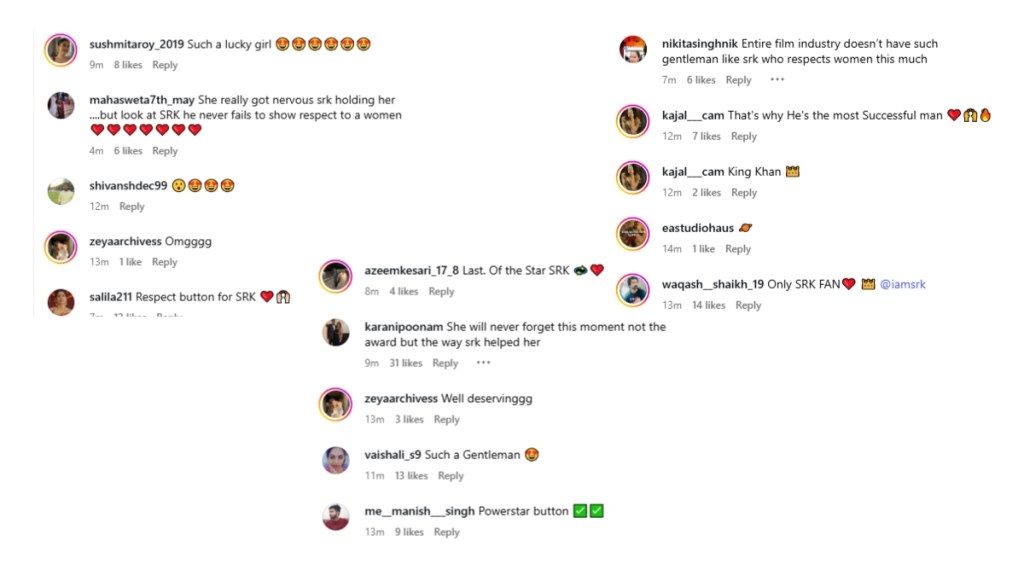 दूसरे यूजर ने इस वीडियो को देखने के बाद कमेंट किया कि वो नर्वस थी, लेकिन एसआरके ने उन्हें संभाल लिया और वो हमेशा औरतों की इज्जत करते हैं. एक और यूजर ने कहा कि वो सच में जेंटलमैन हैं. एक और यूजर ने कहा कि और इसलिए ही वो इतने सक्सेसफुल इंसान हैं. एक अन्य ने लिखा कि किंग खान ने दिल जीत लिया. इस तरह यूजर्स ने इस वीडियो पर प्यार लुटाया है.