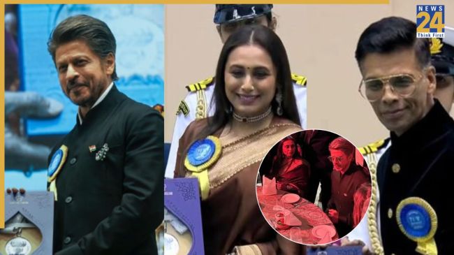 71st National Award Shahrukh Khan-Rani Mukherjee: 71वें नेशनल अवॉर्ड समारोह फिल्मी सितारों के लिए यादगार रहा. राष्ट्रपति द्रौपदी मुर्मू ने शाहरुख खान, रानी मुखर्जी, करण जौहर, विक्रांत मैसी और मोहनलाल जैसे बड़े सितारों को अवॉर्ड से सम्मानित किया गया. अब शाहरुख खान, रानी मुखर्जी और करण जौहर की एक फोटो काफी वायरल हो रही है. इसमें ये तीनों सितारे राष्ट्रपति भवन में बैठे हुए साथ में रॉयल डिनर करते नजर आ रहे हैं. तीनों की बॉन्डिंग को सोशल मीडिया पर खूब प्यार मिल रहा है. वहीं ये फोटो सामने आते ही तेजी से वायरल हो गई.