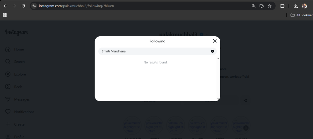 पलाश मुच्छल ही नहीं अब उनकी बहन पलक ने भी स्मृति मंधाना को अपने इंस्टाग्राम से अनफॉलो कर दिया है. शादी के समय और उससे पहले दोनों का रिश्ता बेहद गहरा था, लेकिन अब ऐसा नहीं है. पलक और पलाश दोनों ने ही स्मृति से हर रिश्ता तोड़ लिया है और अपनी-अपनी लाइफ में दोनों ही आगे बढ़ रहे हैं. हालांकि, इस शादी के कैंसिल होने की वजह सामने नहीं आई है.