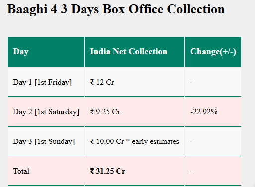 Sacnilk की रिपोर्ट के अनुसार टाइगर की मूवी ने तीसरे दिन 10 करोड़ की कमाई की। इन आंकड़ों के हिसाब से ‘बागी 4’ ने तीन दिनों में 31.25 करोड़ की धमाकेदार कमाई कर ली है। इस मूवी ने कमाई के मामले में 5 फिल्मों को पीछे छोड़ दिया है। इनमें विक्रांत मैसी की ‘आंखों की गुस्ताखियां’, शाहिद कपूर की ‘देवा’, राजकुमार राव की मालिक, सारा अली खान की ‘मेट्रो इन दिनों’ और जॉन अब्राहम की ‘द डिप्लोमैट’ शामिल है।