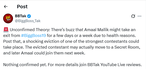 इसके साथ ही एक और बड़ी खबर सामने आ रही है. ‘बीबी तक’ के अनुसार अमाल मलिक अपने स्वास्थ्य कारणों के चलते बिग बॉस के घर से कुछ समय के लिए बाहर जा सकते हैं. वहीं सोशल मीडिया पर अमाल के पिता डब्बू मलिक का एक ट्वीट खूब वायरल हो रहा है, जिसमें वो बोल रहे हैं कि 28 को बाहर मिलते हैं. हालांकि डब्बू ने इस ट्वीट में किसी का नाम नहीं लिया है लेकिन अफवाहें हैं कि अमाल को अपनी हेल्थ की वजह से कुछ दिनों के लिए बिग बॉस के घर से बाहर जाना पड़ सकता है. बाद में उन्हें घर में वापस लाया जाएगा.