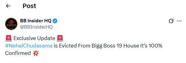 बिग बॉस के फैन पेज ‘बीबी तक’ के मुताबिक इस हफ्ते डबल एविक्शन देखने को मिलेगा. 1 सदस्य को ऑडियंस एविक्ट करेगी वहीं दूसरे कंटेस्टेंट की किस्मत घरवालों के हाथों में होगी. घरवाले किसी एक सदस्य को मिलकर वोट आउट करते नजर आने वाले हैं. ‘बीबी इनसाइडर’ की रिपोर्ट के अनुसार जो पहला कंफर्म सदस्य घर से बेघर होने वाला है उसका नाम नेहल चुडासमा है. नेहल ऑडियंस से कम वोट्स मिलने के बाद घर से बेघर होंगी. वहीं नेहल का गेम भी ऑडियंस को कुछ खास समझ नहीं आ रहा है.