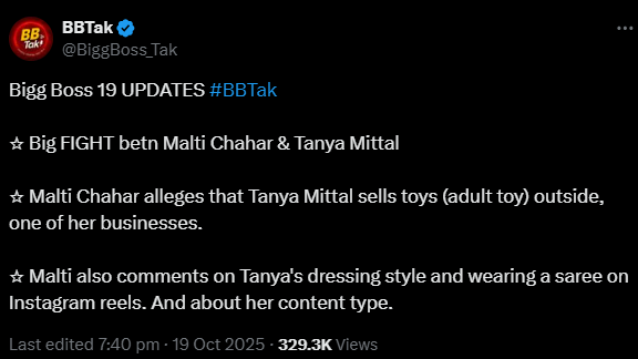 Bigg Boss 19: рд╕рд▓рдорд╛рди рдЦрд╛рди рдХрд╛ рд░рд┐рдпрд▓рд┐рдЯреА рд╢реЛ рдмрд┐рдЧ рдмреЙрд╕ 19 рд╕реБрд░реНрдЦрд┐рдпреЛрдВ рдореЗрдВ рдЫрд╛рдпрд╛ рд╣реБрдЖ рд╣реИ. рд╢реЛ рдореЗрдВ рдЖрдП рджрд┐рди рдирдП-рдирдП рдбреНрд░рд╛рдореЗ рджреЗрдЦрдиреЗ рдХреЛ рдорд┐рд▓ рд░рд╣реЗ рд╣реИрдВ. рд╣рд╛рд▓ рд╣реА рдореЗрдВ рд╣реБрдП рд╡реАрдХреЗрдВрдб рдХрд╛ рд╡рд╛рд░ рдореЗрдВ рд╕рд▓рдорд╛рди рдЦрд╛рди рдиреЗ рдЕрдорд╛рд▓ рдорд▓рд┐рдХ, рдорд╛рд▓рддреА рдЪрд╛рд╣рд░ рдФрд░ рд╢рд╣рдмрд╛рдЬ рдмрджреЗрд╢рд╛ рдХреА рдЬрдордХрд░ рдХреНрд▓рд╛рд╕ рд▓рдЧрд╛рдИ. рд╡рд╣реАрдВ рдЕрдм рдореЗрдХрд░реНрд╕ рдиреЗ рдирдпрд╛ рдкреНрд░реЛрдореЛ рдЬрд╛рд░реА рдХрд┐рдпрд╛ рд╣реИ, рдЬрд┐рд╕рдореЗрдВ рдорд╛рд▓рддреА рдЪрд╛рд╣рд░ рдПрдХ рдмрд╛рд░ рдлрд┐рд░ рддрд╛рдиреНрдпрд╛ рдорд┐рддреНрддрд▓ рдХреЛ рдПрдХреНрд╕рдкреЛрдЬ рдХрд░рддреА рджрд┐рдЦрд╛рдИ рджреАрдВ. рдорд╛рд▓рддреА рдмрд┐рдЧ рдмреЙрд╕ рдХреЗ рдШрд░рд╡рд╛рд▓реЛрдВ рд╕реЗ рддрд╛рдиреНрдпрд╛ рдХреА рдмрд╛рд╣рд░ рдХреА рд╡рд╛рдпрд░рд▓ рд░реАрд▓реНрд╕ рдХреЗ рдмрд╛рд░реЗ рдореЗрдВ рдмрд╛рддреЗрдВ рдХреА рдФрд░ рддрд╛рдиреНрдпрд╛ рдХреА рд╕рдВрд╕реНрдХрд╛рд░реА рд╡рд╛рд▓реА рдЗрдореЗрдЬ рдкрд░ рд╕рд╡рд╛рд▓ рдЙрдард╛рддреА рдирдЬрд░ рдЖрдИрдВ.