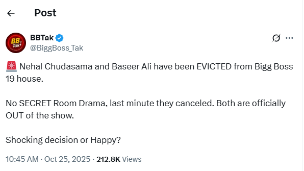 Bigg Boss 19: рд╕рд▓рдорд╛рди рдЦрд╛рди рдХреЗ рд░рд┐рдпрд▓рд┐рдЯреА рд╢реЛ рдмрд┐рдЧ рдмреЙрд╕ 19 рдореЗрдВ рдЖрдП рджрд┐рди рдирдП-рдирдП рдЯреНрд╡рд┐рд╕реНрдЯ рджреЗрдЦрдиреЗ рдХреЛ рдорд┐рд▓ рд░рд╣реЗ рд╣реИрдВ. рд╢реЛ рдореЗрдВ рдПрд╡рд┐рдХреНрд╢рди рдХреЛ рд▓реЗрдХрд░ рднреА рдмрдбрд╝реА рдЦрдмрд░ рд╕рд╛рдордиреЗ рдЖ рд░рд╣реА рд╣реИ. рдЗрд╕ рдмрд╛рд░ рдПрдХ рдирд╣реАрдВ рдмрд▓реНрдХрд┐ 2 рдХрдВрдЯреЗрд╕реНрдЯреЗрдВрдЯреНрд╕ рдХрд╛ рдкрддреНрддрд╛ рдШрд░ рд╕реЗ рд╕рд╛рдл рд╣реЛрдиреЗ рд╡рд╛рд▓рд╛ рд╣реИ. рд╡реАрдХреЗрдВрдб рдХрд╛ рд╡рд╛рд░ рдореЗрдВ рд╕рд▓рдорд╛рди рдЦрд╛рди рдиреЙрдорд┐рдиреЗрдЯреЗрдб рд╕рджрд╕реНрдпреЛрдВ рдореЗрдВ рд╕реЗ 2 рдХрдВрдЯреЗрд╕реНрдЯреЗрдВрдЯреНрд╕ рдХреЛ рдмрд╛рд╣рд░ рдХрд╛ рд░рд╛рд╕реНрддрд╛ рджрд┐рдЦрд╛рддреЗ рдирдЬрд░ рдЖрдиреЗ рд╡рд╛рд▓реЗ рд╣реИрдВ. рд╣рд╛рд▓рд╛рдВрдХрд┐ рдЕрднреА рддрдХ рдЗрд╕ рдмрд╛рдд рдкрд░ рдореЗрдХрд░реНрд╕ рдиреЗ рдХреЛрдИ рдЪреБрдкреНрдкреА рдирд╣реАрдВ рддреЛрдбрд╝реА рд╣реИ, рд▓реЗрдХрд┐рди рд╕реЛрд╢рд▓ рдореАрдбрд┐рдпрд╛ рдкрд░ рдбрдмрд▓ рдПрд╡рд┐рдХреНрд╢рди рдХреА рдЦрдмрд░реЗрдВ рдЬреЛрд░реЛрдВ-рд╢реЛрд░реЛрдВ рдкрд░ рд╣реИрдВ. рдЪрд▓рд┐рдП рдЬрд╛рдирддреЗ рд╣реИрдВ рдЗрд╕ рдмрд╛рд░ рдХреМрди-рдХреМрди рдПрд▓рд┐рдорд┐рдиреЗрдЯ рд╣реЛрдиреЗ рд╡рд╛рд▓рд╛ рд╣реИ?
