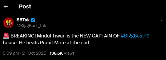 ‘बिग बॉस 19’ के फैन पेज ‘बीबी तक’ की रिपोर्ट के अनुसार घर का नया कैप्टन यूट्यूबर मृदुल तिवारी बना है. कैप्टेंसी टास्क में प्रणित मोरे को हराकर मृदुल घर में अपनी सरकार लेकर आ गए हैं. हालांकि कैप्टेंसी टास्क अभी तक घर में दिखाया नहीं गया है. अपकमिंग एपिसोड में घरवालों के बीच कैप्टेंसी की रेस देखने को मिलेगी. मृदुल के कैप्टन बनने से एक बार फिर घरवाले तरीके से सभी रूल्स फॉलो करते नजर आने वाले हैं. इसके साथ ही घरवाले घर की ड्यूटी भी करते नजर आएंगे.