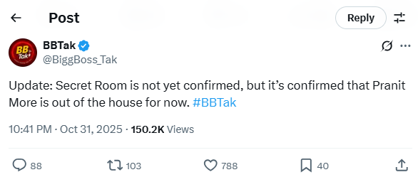 ‘बिग बॉस 19’ के फैन पेज ‘बीबी तक’ के अनुसार इस हफ्ते नॉमिनेटेड सदस्यों में से प्रणित मोरे एविक्ट हो गए हैं. हालांकि रिपोर्ट के अनुसार प्रणित को सीक्रेट रूम में रखा जाएगा. इसके साथ ही खबरें तो ये भी हैं कि मेडिकल इमरजेंसी के लिए प्रणित मोरे को घर से एविक्ट किया जा रहा है. वहीं कुछ समय बाद उन्हें घर में वापस भी भेज दिया जाएगा. बता दें प्रणित मोरे के एविक्शन की खबर से सोशल मीडिया पर भी हलचल मच गई है. फैंस भी उनके एविक्शन की खबर से चौंक गए हैं.