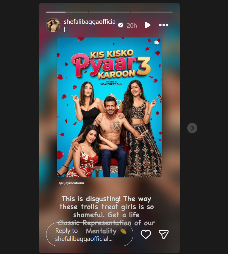 शेफाली बग्गा ने अपनी इंस्टाग्राम पर इस पोस्टर को शेयर करते हुए ट्रोलर्स को खूब लताड़ा है. शेफाली ने लिखा, 'ये बेहद घिनौना है! जिस तरह से ये ट्रोलर्स लड़कियों के साथ ऐसा बर्ताव करते हैं, वो बेहद शर्मनाक है. अपनी जिंदगी जियो! हमारी हर बात पर तुरंत रिएक्ट करने वाली सोच का ये एक साफ उदाहरण है.' वहीं इससे पहले युजवेंद्र चहल ने भी इस पर मजाकिया रिएक्शन दिया था. युजवेंद्र ने पोस्टर जारी करने वाले मीम पेज के कमेंट सेक्शन में लिखा था, '2-3 रह गए एडमिन, अगली बार बेहतर रिसर्च करना.'