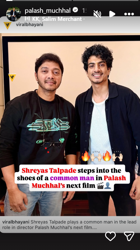 दरअसल, पलाश मुच्छल ने अपने सोशल मीडिया पर विरल भयानी के एक पोस्ट को रिपोस्ट किया है. इस पोस्ट में जानकारी दी गई है कि पलाश जल्द ही नई फिल्म बनाने वाले हैं. पलाश की इस फिल्म का नाम तो अभी सामने नहीं आया है, लेकिन फिल्म का निर्देशन पलाश ही करने वाली हैं. इस फिल्म में लीड एक्टर के तौर पर श्रेयस तलपड़े नजर आने वाले हैं.