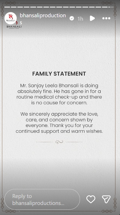 दरअसल, जैसे ही अफवाह उड़ी कि संजय लीला भंसाली को हार्ट अटैक आया है, तो bhansaliproductions के ऑफिशियल इंस्टाग्राम अकाउंट पर एक स्टोरी शेयर की गई. ये पोस्ट फिल्ममेकर के परिवार की ओर से शेयर की गई है. पोस्ट में लिखा गया है कि संजय लीला भंसाली एकदम ठीक हैं और वो सिर्फ रूटीन चेकअप के लिए अस्पताल गए थे.