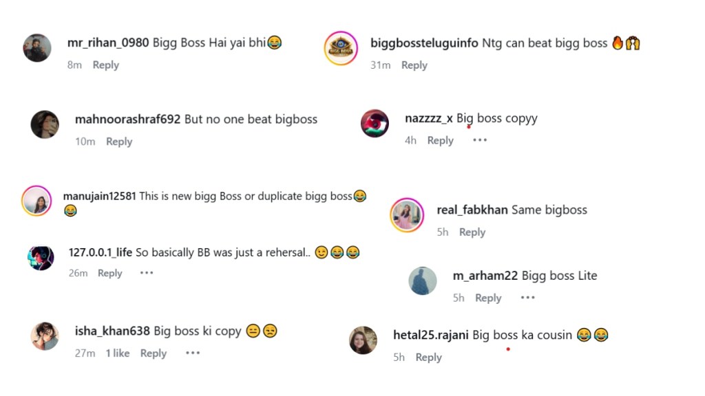 एक और यूजर ने लिखा कि तो क्या बिग बॉस बस एक रिहर्सल है. एक अन्य यूजर ने लिखा कि बिग बॉस की कॉपी. एक और ने कहा कि बिग बॉस को बीट नहीं कर सकता. एक अन्य ने कहा कि बिग बॉस की कॉपी. एक और यूजर ने लिखा कि बिग बॉस जैसा. एक और ने लिखा कि बिग बॉस लाइट. एक अन्य ने कहा कि बिग बॉस का कजिन.