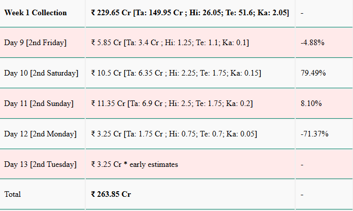 वहीं दूसरी ओर रजनीकांत की ‘कुली’ ने 13वें दिन ‘वॉर 2’ से ज्यादा का कलेक्शन किया। रजनीकांत की एक्शन मूवी ने 3.25 करोड़ की कमाई की। इसकी तमिल ऑक्यूपेंसी 15.14% रही। सुबह के शो 12.39%, दोपहर के शो 13.70%, शाम के शो 15.11% और रात के शो 19.36% रहे। मूवी की कुल कमाई की बात करें तो ‘कुली’ ने भारत में 263.85 करोड़ का बिजनेस कर लिया है।