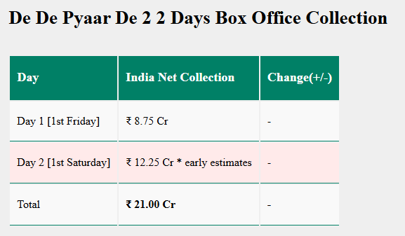 рдЕрдЬрдп рджреЗрд╡рдЧрди рдХреА ‘рджреЗ рджреЗ рдкреНрдпрд╛рд░ рджреЗ 2’ рдиреЗ рдкрд╣рд▓реЗ рджрд┐рди рдмреЙрдХреНрд╕ рдСрдлрд┐рд╕ рдкрд░ рдзреАрдореА рд╢реБрд░реБрдЖрдд рдХреА рдереА. рдлрд┐рд▓реНрдо рдиреЗ 8.75 рдХрд░реЛрдбрд╝ рдХрд╛ рдХрд▓реЗрдХреНрд╢рди рдХрд┐рдпрд╛ рдерд╛. рд╡рд╣реАрдВ рдЕрдм 2 рджрд┐рдиреЛрдВ рдореЗрдВ рдлрд┐рд▓реНрдо рдХрд╛ рдХрд▓реЗрдХреНрд╢рди 21 рдХрд░реЛрдбрд╝ рд╣реЛ рдЧрдпрд╛ рд╣реИ. рд╢реБрд░реБрдЖрддреА рджрд┐рдиреЛрдВ рдХреЗ рдореБрддрд╛рдмрд┐рдХ рдореВрд╡реА рдХреА рдХрдорд╛рдИ рдЕрдЪреНрдЫреА рд╣реЛрддреА рджрд┐рдЦрд╛рдИ рджреЗ рд░рд╣реА рд╣реИ. рд╣рд╛рд▓рд╛рдВрдХрд┐ рдпреЗ рдЖрдВрдХрдбрд╝рд╛ рдЕрдкрдХрдорд┐рдВрдЧ рджрд┐рдиреЛрдВ рдореЗрдВ рдФрд░ рдЬреНрдпрд╛рджрд╛ рдЕрдЪреНрдЫрд╛ рд╣реЛ рд╕рдХрддрд╛ рд╣реИ. рд╕реЛрд╢рд▓ рдореАрдбрд┐рдпрд╛ рдкрд░ рдореВрд╡реА рдХреА рдЬрд┐рддрдиреА рддрд╛рд░реАрдл рдХреА рдЬрд╛ рд░рд╣реА рд╣реИ рдЙрд╕реЗ рджреЗрдЦрдХрд░ рддреЛ рд▓рдЧ рд░рд╣рд╛ рд╣реИ рдХрд┐ рдпреЗ рдлрд┐рд▓реНрдо рднреА рдЗрд╕ рд╕рд╛рд▓ рдХреА рдмрдбрд╝реА рдлрд┐рд▓реНрдореЛрдВ рдХреА рд▓рд┐рд╕реНрдЯ рдореЗрдВ рд╢рд╛рдорд┐рд▓ рд╣реЛ рд╕рдХрддреА рд╣реИ.