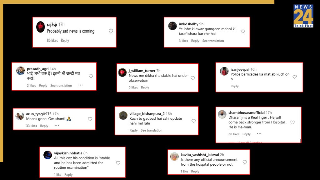 рдПрдХ рддреАрд╕рд░реЗ рдпреВрдЬрд░ рдиреЗ рд▓рд┐рдЦрд╛ рдХрд┐ рднрд╛рдИ рдЕрднреА рддрдХ рдирд╣реАрдВ, рдЗрддрдиреА рдЬрд▓реНрджреА рдордд рдХрд░реЛ. рдПрдХ рдЕрдиреНрдп рдпреВрдЬрд░ рдиреЗ рдХрд╣рд╛ рдХрд┐ рдиреНрдпреВрдЬ рдореЗрдВ рджрд┐рдЦ рд░рд╣рд╛ рд╣реИ рдХрд┐ рд╡реЛ рдЕрдВрдбрд░ рдСрдмреНрдЬрд░реНрд╡реЗрд╢рди рд╣реИрдВ. рдПрдХ рдиреЗ рдХрд╣рд╛ рдХрд┐ рдпреЗ рд▓реЛрд╣реЗ рдХреА рдЖрд╡рд╛рдЬ рдЧрдордЧреАрди рдорд╛рд╣реМрд▓ рдХреА рдУрд░ рдЗрд╢рд╛рд░рд╛ рдХрд░ рд░рд╣реА рд╣реИ. рдПрдХ рдЕрдиреНрдп рдпреВрдЬрд░ рдиреЗ рд▓рд┐рдЦрд╛ рдХрд┐ рдХреНрдпрд╛ рдЕрд╕реНрдкрддрд╛рд▓ рд╕реЗ рдХреЛрдИ рдСрдлрд┐рд╢рд┐рдпрд▓ рдЬрд╛рдирдХрд╛рд░реА рдЖрдИ рд╣реИ? рдПрдХ рдиреЗ рдХрд╣рд╛ рдХрд┐ рдзрд░рдо рдЬреА рд░рд┐рдпрд▓ рдЯрд╛рдЗрдЧрд░ рд╣реИрдВ рдФрд░ рд╡реЛ рдордЬрдмреВрдд рд╣реЛрдХрд░ рдЕрд╕реНрдкрддрд╛рд▓ рд╕реЗ рд╡рд╛рдкрд╕ рдЖрдПрдВрдЧреЗ.