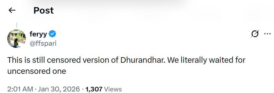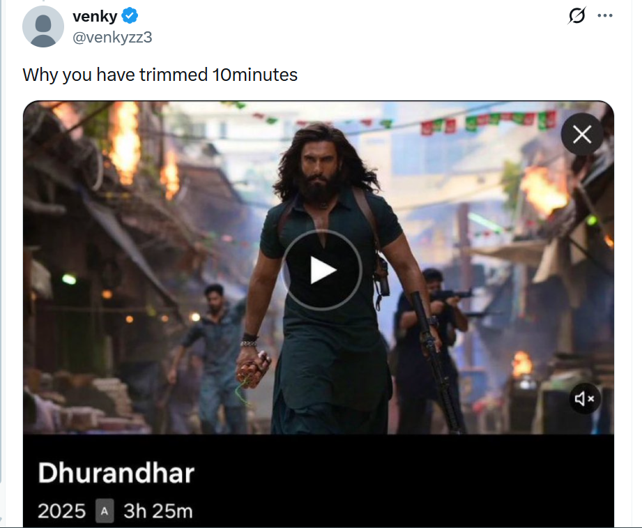 рд╡рд╣реАрдВ рд╕реЛрд╢рд▓ рдореАрдбрд┐рдпрд╛ рдкрд░ рдХреБрдЫ рдпреВрдЬрд░реНрд╕ рдиреЗ рдкреЛрд╕реНрдЯ рд╢реЗрдпрд░ рдХрд░рддреЗ рд╣реБрдП рджрд╛рд╡рд╛ рдХрд┐рдпрд╛ рд╣реИ рдХрд┐ рдлрд┐рд▓реНрдо рдХреЗ рдЧрд╛рд▓рд┐рдпреЛрдВ рд╡рд╛рд▓реЗ рдбрд╛рдпрд▓реЙрдЧ рдХреЛ рдореНрдпреВрдЯ рдХрд┐рдпрд╛ рдЧрдпрд╛ рд╣реИ рдФрд░ рд╕рд╛рде рд╣реА 10 рдорд┐рдирдЯ рдХреЗ рд╕реАрди рдХреЛ рдХрдЯ рдХрд░ рджрд┐рдпрд╛ рдЧрдпрд╛ рд╣реИ. рдпреВрдЬрд░реНрд╕ рдУрдЯреАрдЯреА рдкрд░ рдЗрд╕ рдлрд┐рд▓реНрдо рдХреЗ рдЕрдирд╕реЗрдВрд╕рд░реНрдб рд╡рд░реНрдЬрди рдХрд╛ рдЗрдВрддрдЬрд╛рд░ рдХрд░ рд░рд╣реЗ рдереЗ. рд▓реЗрдХрд┐рди рдлрд┐рд▓реНрдо рдХреЗ рд╕реАрдиреНрд╕ рд╣реА рдХрдЯ рдХрд░ рджрд┐рдП рдЧрдП рд╣реИрдВ. рдПрдХ рдпреВрдЬрд░ рдиреЗ рд▓рд┐рдЦрд╛, 'рдпреЗ рдЕрднреА рднреА рдзреБрд░рдВрдзрд░ рдХрд╛ рд╕реЗрдВрд╕рд░ рдХрд┐рдпрд╛ рд╣реБрдЖ рд╡рд░реНрдЬрди рд╣реИ. рд╣рдо рд╕рдЪрдореБрдЪ рдмрд┐рдирд╛ рд╕реЗрдВрд╕рд░ рд╡рд╛рд▓реЗ рд╡рд░реНрдЬрди рдХрд╛ рдЗрдВрддрдЬрд╛рд░ рдХрд░ рд░рд╣реЗ рдереЗ. рд╕реЛрд╢рд▓ рдореАрдбрд┐рдпрд╛ рдкрд░ рджреВрд╕рд░реЗ рдпреВрдЬрд░ рдиреЗ рдзреБрд░рдВрдзрд░ рдХреА рдкреЛрд╕реНрдЯ рд╢реЗрдпрд░ рдХрд░рддреЗ рд╣реБрдП рд▓рд┐рдЦрд╛, '10 рдорд┐рдирдЯ рдХрд╛ рд╕реАрди рдХрд╛рдЯрд╛ рдЧрдпрд╛ рд╣реИ.'