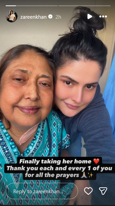 अभिनेत्री जरीन खान की मां को अस्पताल से छुट्टी मिल गई है. इसकी जानकारी खुद जरीन ने इंस्टाग्राम पर स्टोरी शेयर करके दी है. जरीन ने अपने पोस्ट में लिखा कि आखिरकार उन्हें घर ले जा रही हूं. आप सभी की दुआओं के लिए धन्यवाद.