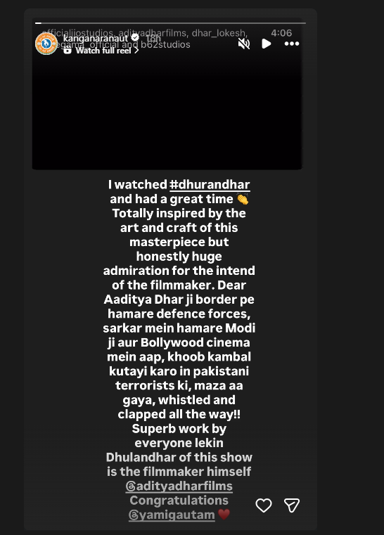 कंगना रनौत ने 'धुरंधर' फिल्म देखी और इंस्टाग्राम पर फिल्म की जमकर तारीफ की. कंगना रनौत ने फिल्ममेकर आदित्य धर को बॉलीवुड का बेस्ट डायरेक्टर बता दिया. एक्ट्रेस ने अपने इंस्टाग्राम स्टोरी पर पोस्ट शेयर करते हुए लिखा, 'मैंने 'धुरंधर' देखी और मजा आ गया. प्रिय आदित्य धर जी, बॉर्डर पर हमारे रक्षा बल, सरकार में हमारे प्रधानमंत्री नरेंद्र मोदी और बॉलीवुड में आप, इन पाकिस्तानी आतंकवादियों की खूब कंबल कुटाई करो, मजा आ गया.'