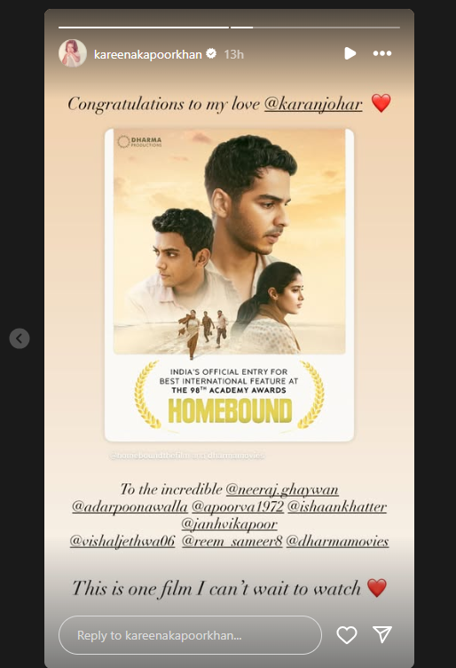 करण जौहर की 'होमबाउंड' ऑस्कर 2026 में भारत को रिप्रेजेंट करती नजर आने वाली है. इसी को लेकर एक्ट्रेस करीना कपूर ने करण जौहर और 'होमबाउंड' मूवी की पूरी टीम को बधाई दी है. इंस्टाग्राम पर स्टोरी शेयर कर एक्ट्रेस ने फिल्म की टीम की तारीफ की.