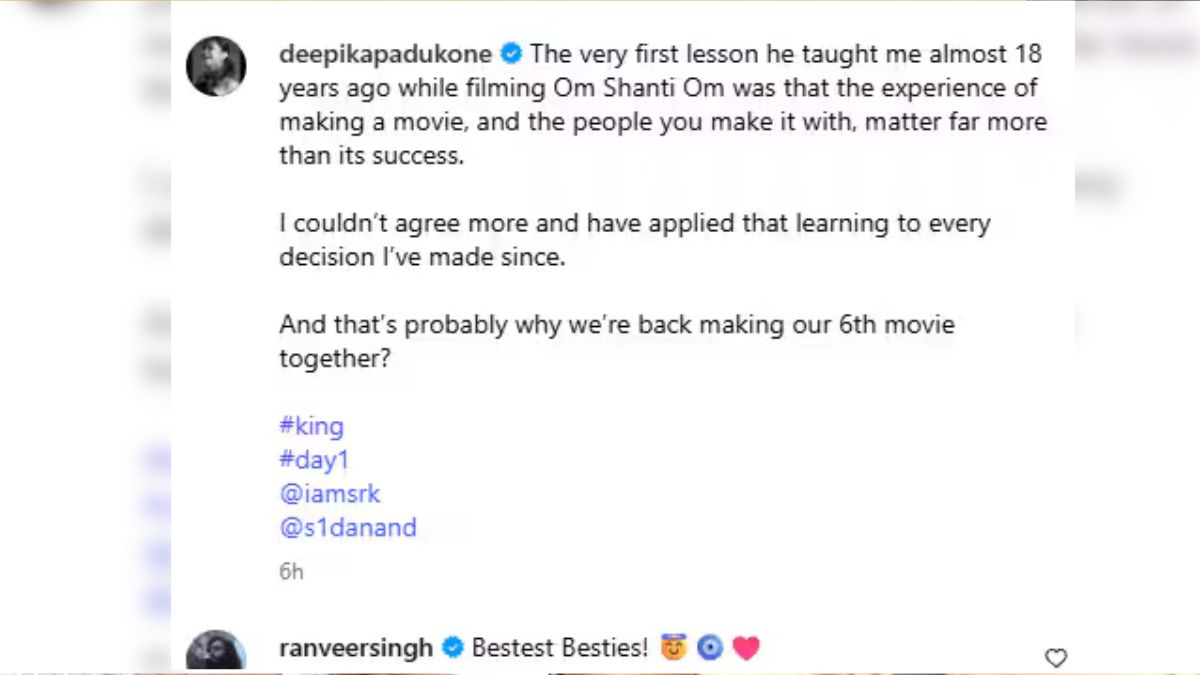 दीपिका पादुकोण 'कल्कि 2' से बाहर हो गई हैं. एक्ट्रेस ने सोशल मीडिया पर पोस्ट शेयर कर बताया कि उन्होंने शाहरुख खान की 'किंग' मूवी की शूटिंग शुरू कर दी है. वहीं रणवीर सिंह ने दीपिका को सोशल मीडिया पर चीयर-अप किया है. रणवीर ने दीपिका की पोस्ट पर स्पेशल कमेंट किया है.