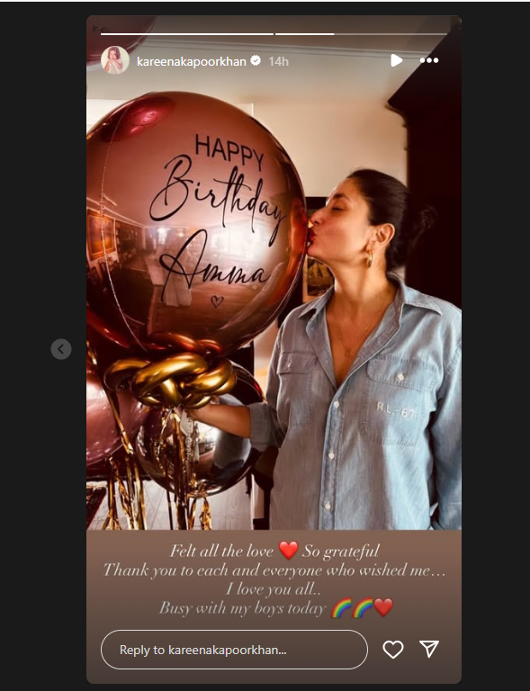 करीना कपूर ने बीते दिन अपना 45वां जन्मदिन मनाया. वहीं एक्ट्रेस ने इंस्टाग्राम स्टोरी पर अपने बर्थडे की एक फोटो शेयर की. जिसमें वो हाथ में एक बलून पकड़े हुए हैं और उस पर लिखा है, 'हैप्पी बर्थडे अम्मा।' सोशल मीडिया पर एक्ट्रेस की ये फोटो काफी वायरल हो रही है. फैंस इसे काफी पसंद कर रहे हैं.