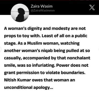 बॉलीवुड की पूर्व एक्ट्रेस जायरा वसीम ने हाल ही में सोशल मीडिया पर एक पोस्ट शेयर किया है. इस पोस्ट में जायरा बिहार के मुख्यमंत्री नीतिश कुमार पर भड़कतीं नजर आईं. जायरा ने नीतीश कुमार के हिजाब खींचने वाली घटना पर आपत्ति जताई है. पढ़िए पूरी खबर