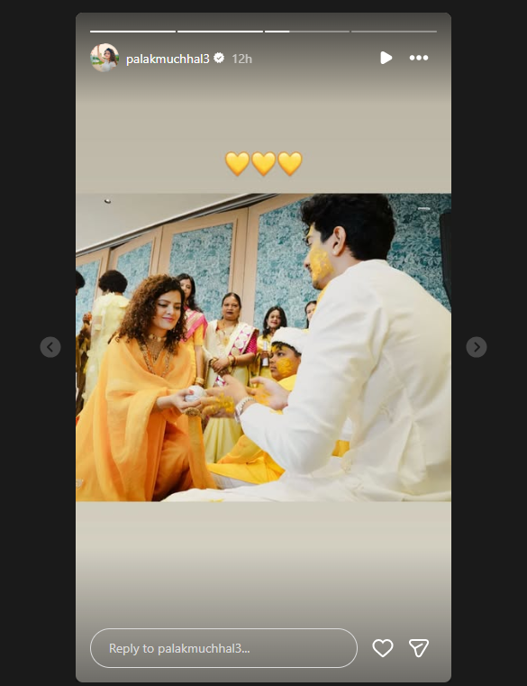 बॉलीवुड सिंगर पलक मुच्छल के भाई पलाश मुच्छल भारतीय महिला क्रिकेटर स्मृति मंदाना से शादी कर रहे हैं. हाल ही में पलाश और स्मृति की हल्दी सेरेमनी की फोटोज वायरल हो रही हैं. पलक ने सोशल मीडिया पर फोटोज शेयर की हैं.