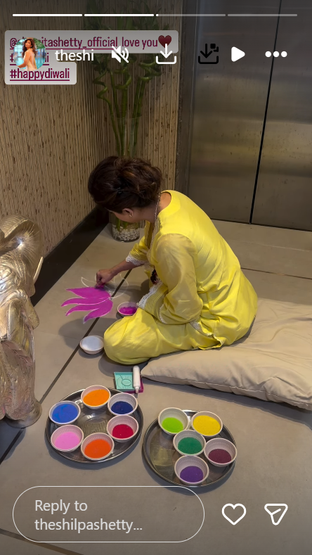 शिल्पा शेट्टी ने अपने इंस्टाग्राम पर एक लेटेस्ट वीडियो शेयर किया है. इस वीडियो में शिल्पा रंगोली बनाते हुए नजर आ रही हैं. वीडियो को शेयर करते हुए शिल्पा ने कैप्शन में लिखा कि रंगोली टाइम.