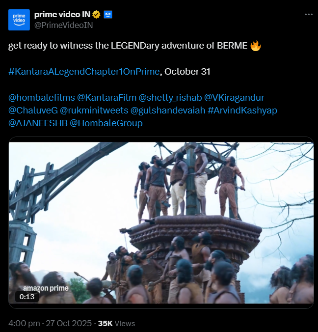 ऋषभ शेट्टी की पॉपुलर फिल्म 'कांतारा चैप्टर 1' 31 अक्तूबर को प्राइम वीडियो पर रिलीज होगी. इसकी जानकारी खुद प्राइम वीडियो ने अपने एक्स अकाउंट पर एक पोस्ट के जरिए दी है.