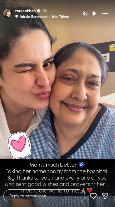 अभिनेत्री जरीन खान की मां अस्पताल में एडमिट थी. जरीन ने अपनी मां का हेल्थ अपडेट शेयर किया है. एक्ट्रेस ने अपने इंस्टाग्राम पर एक पोस्ट शेयर किया है, जिसमें वो अपनी मां के साथ नजर आ रही हैं. पोस्ट को शेयर करते हुए जरीन ने लिखा है कि मां अब पहले से बेहतर हैं. आज उन्हें हॉस्पिटल से डिस्चार्ज मिल गया है. सभी का धन्यवाद.