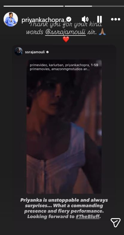 प्रियंका चोपड़ा अपनी अपकमिंग फिल्म 'द ब्लफ' को लेकर चर्चा में हैं. हाल ही में इसका ट्रेलर जारी किया गया है, जिसमें एक्ट्रेस को एक्शन मोड में देखा गया. इसे देखने के बाद फिल्ममेकर एसएस राजामौली ने प्रियंका की एक्टिंग के मुरीद हो गए. उन्होंने एक्ट्रेस को 'हमेशा की तरह ही अनस्टॉपेबल' बताया. साथ ही वह उनकी परफॉर्मेंस को देखने के लिए काफी एक्साइटेड भी हैं. इसके लिए एक्ट्रेस ने उनका शुक्रिया भी अदा किया है.