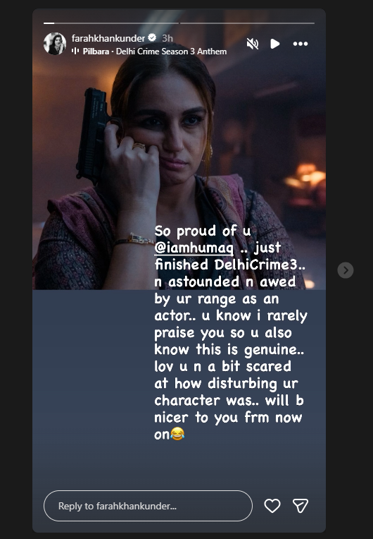 नेटफ्लिक्स की 'दिल्ली क्राइम 3' सीरीज इन दिनों सुर्खियों में बनी हुई है. हाल ही में फराह खान ने सीरीज देखकर हुमा कुरैशी की तारीफ की है. साथ ही कहा कि अब उन्हें हुमा से डर लगने लगा है.