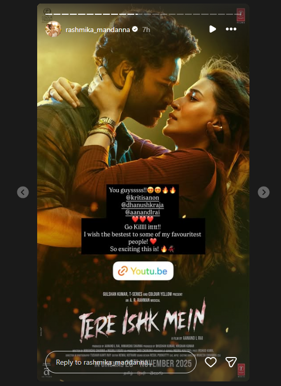 रश्मिका मंदाना ने हाल ही में रिलीज हुए 'तेरे इश्क में' मूवी के ट्रेलर को एक्साइटिंग बताया है. कृति सेनन और धनुष की तारीफ करते हुए रश्मिका ने स्टोरी शेयर की है.