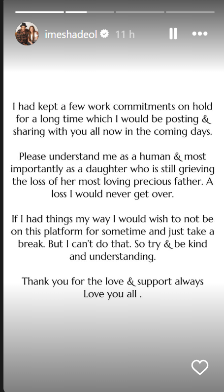 एक्ट्रेस ने लिखा कि उन्होंने कुछ वर्क कमिटमेंट्स को काफी समय से होल्ड पर रखा था. लेकिन अब सोच रही हैं कि कुछ को पोस्ट कर दें. उन्होंने लिखा कि वह आने वाले दिनों में शूट्स लोगों के साथ शेयर करेंगी. ईशा ने लोगों से बतौर इंसान उन्हें समझने की कोशिश करने की बात कही. उन्होंने मेकर्स से दरख्वास्त की कि ये समय उस बेटी के बहुत ही मुश्किल भरा है, जिसने अपने पिता को खो दिया. उन्होंने पिता को खोने को लेकर कहा कि ये उनकी जिंदगी का ऐसा लॉस है, जिससे उनके लिए निकल पाना बहुत मुश्किल हो रहा है.