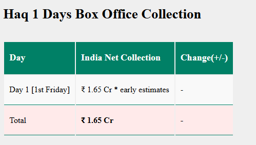 Sacnilk की रिपोर्ट के अनुसार यामी गौतम की ‘हक’ ने पहले दिन 1.65 करोड़ की कमाई की है. इसकी हिंदी ऑक्यूपेंसी 9.97% की. शोज की बात करें तो सुबह के शो 5.66%, दोपहर के शो 8.19%, शाम के शो 9.54% और रात के शो 16.50% रहे. पहले दिन धीमी शुरुआत करने वाली यामी गौतम की ‘हक’ की कमाई में वीकेंड पर उछाल देखने को मिल सकता है. वहीं यामी गौतम की एक्टिंग की काफी तारीफ की जा रही है.