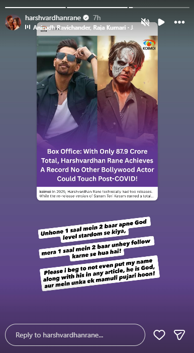 рджрд░рдЕрд╕рд▓, рд╣рд░реНрд╖рд╡рд░реНрдзрди рд░рд╛рдгреЗ рдиреЗ рдЕрдкрдиреЗ рдЗрдВрд╕реНрдЯрд╛рдЧреНрд░рд╛рдо рд╕реНрдЯреЛрд░реА рдкрд░ рдПрдХ рдкреЛрд╕реНрдЯ рд╢реЗрдпрд░ рдХрд┐рдпрд╛ рд╣реИ. рдЗрд╕ рд╕реНрдЯреЛрд░реА рдореЗрдВ рд╣рд░реНрд╖рд╡рд░реНрдзрди рд░рд╛рдгреЗ рдиреЗ рдХрд╣рд╛ рд╣реИ рдХрд┐ рд╢рд╛рд╣рд░реБрдЦ рдЦрд╛рди рднрдЧрд╡рд╛рди рд╣реИрдВ рдФрд░ рдореИрдВ рдЙрдирдХрд╛ рдПрдХ рдорд╛рдореВрд▓реА-рд╕рд╛ рдкреБрдЬрд╛рд░реА рд╣реВрдВ. рдЗрд╕рдХреЗ рдЕрд▓рд╛рд╡рд╛ рдЕрдкрдиреЗ рдкреЛрд╕реНрдЯ рдореЗрдВ рд╣рд░реНрд╖рд╡рд░реНрдзрди рд░рд╛рдгреЗ рдиреЗ рдХрд╣рд╛ рдХрд┐ рд╢рд╛рд╣рд░реБрдЦ рдЦрд╛рди рдХреЗ рд╕рд╛рде рдЙрдирдХреА рддреБрд▓рдирд╛ рдирд╛ рдХреА рдЬрд╛рдП. рдЙрдиреНрд╣реЛрдВрдиреЗ 1 рд╕рд╛рд▓ рдореЗрдВ 2 рдмрд╛рд░ рдЕрдкрдиреЗ рдЧреЙрдб рд▓реЗрд╡рд▓ рд╕реНрдЯрд╛рд░рдбрдо рд╕реЗ рдХрд┐рдпрд╛ рдФрд░ рдореЗрд░рд╛ 1 рд╕рд╛рд▓ рдореЗрдВ 2 рдмрд╛рд░ рдЙрдиреНрд╣реЗрдВ рдлреЙрд▓реЛ рдХрд░рдиреЗ рд╕реЗ рд╣реБрдЖ рд╣реИ. рдореИрдВ рд╡рд┐рдирддреА рдХрд░рддрд╛ рд╣реВрдВ рдХрд┐ рдХрд┐рд╕реА рднреА рдЖрд░реНрдЯрд┐рдХрд▓ рдореЗрдВ рдЙрдирдХреЗ рд╕рд╛рде рдореЗрд░рд╛ рдирд╛рдо рднреА рдирд╛ рдбрд╛рд▓реЗрдВ.